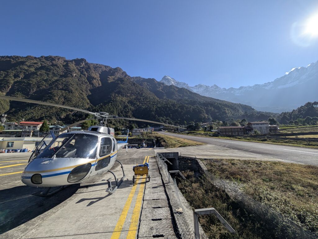 Der Trek startet in Lukla. Die Ortschaft mit der steilsten und kürzesten Landebahn der Welt. Gewöhnlich fliegt man mit kleinen Flugzeugen eine dreiviertel Stunde hin. Aber glücklicherweise bekomme ich dank Alpine Ramble und Air Dynastie die fantastische Gelegenheit mit einem Helikopter hinzufliegen. Das ist bei dem Bergpanorama und bestem Wetter natürlich ein Traum.