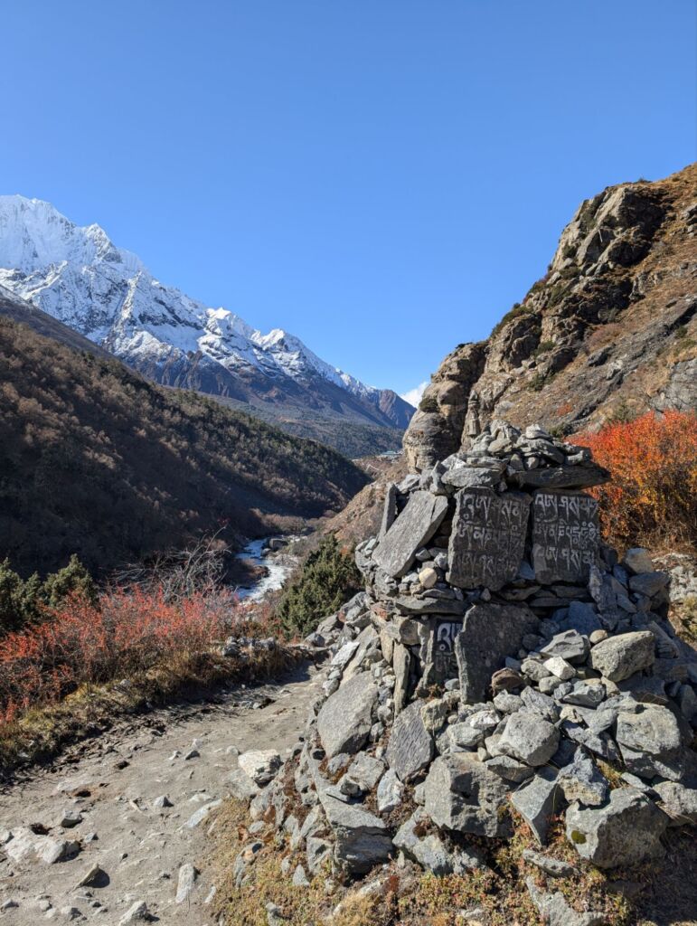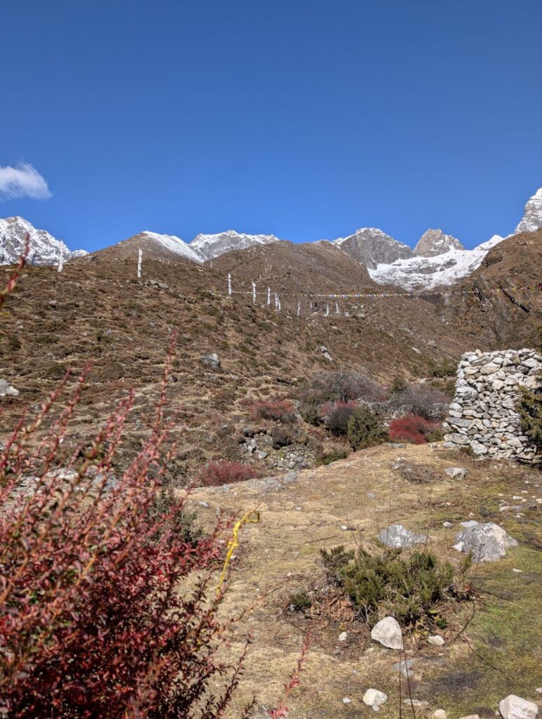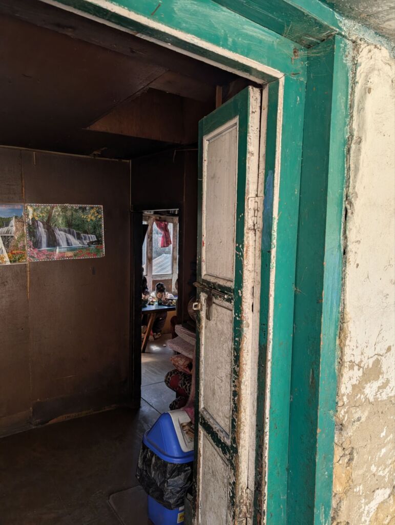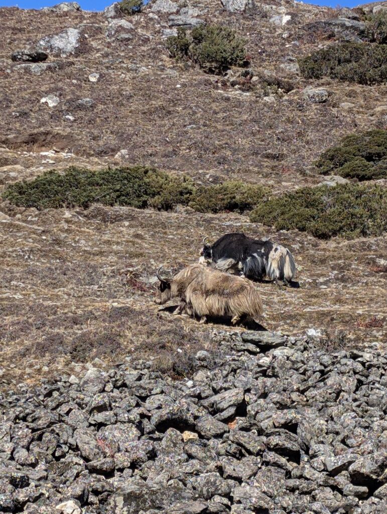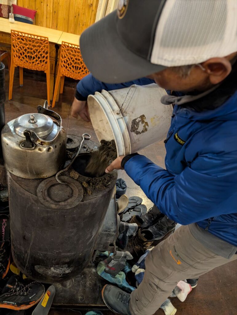 Wer hätte es gedacht…wenn man den Berg raufklettert muss man ihn auch wieder runtergehen 🙂 warum wir das aber so schnell machen müssen?? Naja es stand heute 8 Stunden Gewaltmarsch für 20 km auf dem Programm. Also wurde der Ofen nochmal mit Yak Dung angefeuert um im Warmen zu frühstücken und dann gestärkt los zu ziehen. Interessant ist, dass die Haustür bis auf die Nacht immer offen steht und die Kälte reinzieht. Nur die Tür zur Stube ist zu. Aber das soll die Offenheit und Gastfreundlichkeit zeigen.