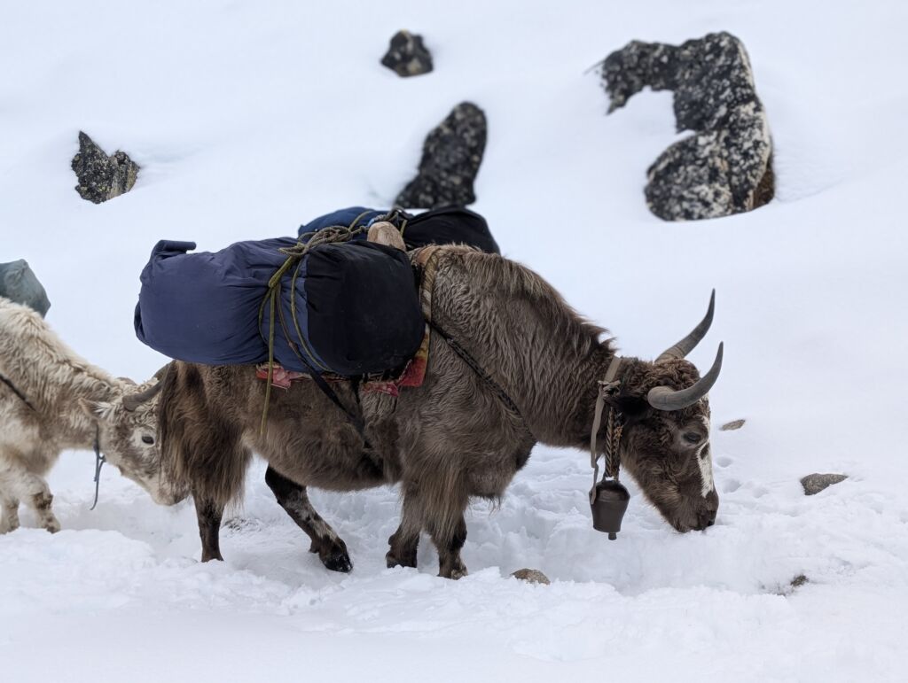 Wir klettern also auf den benachbarten Nangkartshang. Zwar nicht bis zum Gipfel, aber wir wollen zumindest die 5.000 m Marke knacken und kämpfen uns durch den frisch gefallen Schnee. Es ist anstrengend, aber auch wunderschön und wir bewältigen die 590 Hm in 2 Stunden ohne Probleme. Die Aussicht geht wegen dem Nebel zwar nicht weit, aber die sportliche Herausforderung und dass wir oben die erste Spur in den Schnee legen, beschert uns ein Hochgefühl. Dann noch 1 h Abstieg zum verdienten Mittagessen.