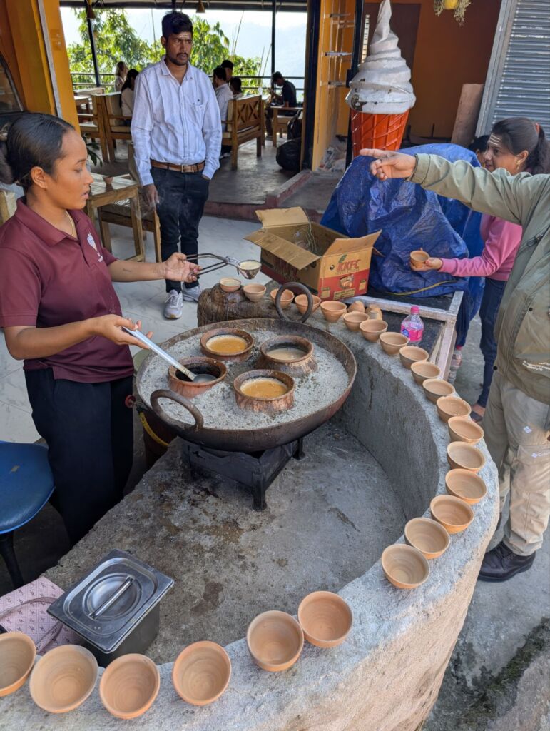 Nach so viel neuem lernen, gönne ich mir erstmal einen traditionellen Tee. Der wird aus diesem Tontöpfen geschöpft und in einem Metallbecher, der in der Glut erhitzt wurde, gegossen. Dort kocht er kurz schäumend auf und wird dann in einen Tonbecher gegossen.