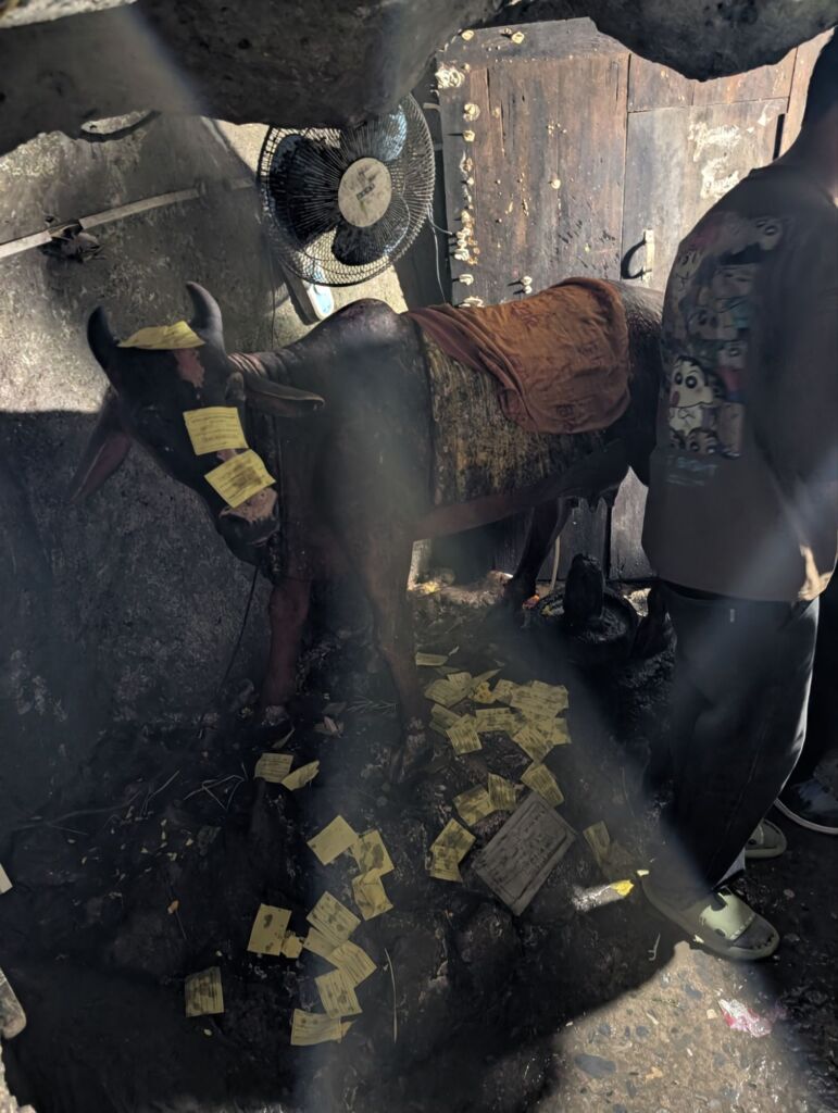 Unten angelangt wartet in enger und feuchter Atmosphäre (nichts für jmd mit Klaustrophobie) ein Tropfstein, der als Shiva verehrt wird (keine Fotos erlaubt) und separat in einer kleinen Höhle Kamadhenu, die heilige Wunschkuh aus der hinduistischen Mythologie. Sie gilt als Ur-Mutter aller Kühe und steht für Fülle, Fruchtbarkeit und Versorgung.