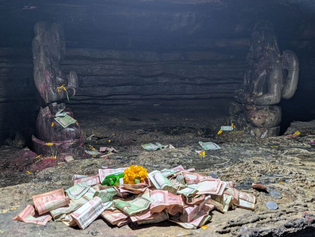 Dann geht es noch weiter hinab. Auch dort stehen zwei kleine Figuren, bei denen Geldopfer gebracht werden. An manchen Stellen fahren die Besucher über den Stein und machen eine Art Begkreuzigung.