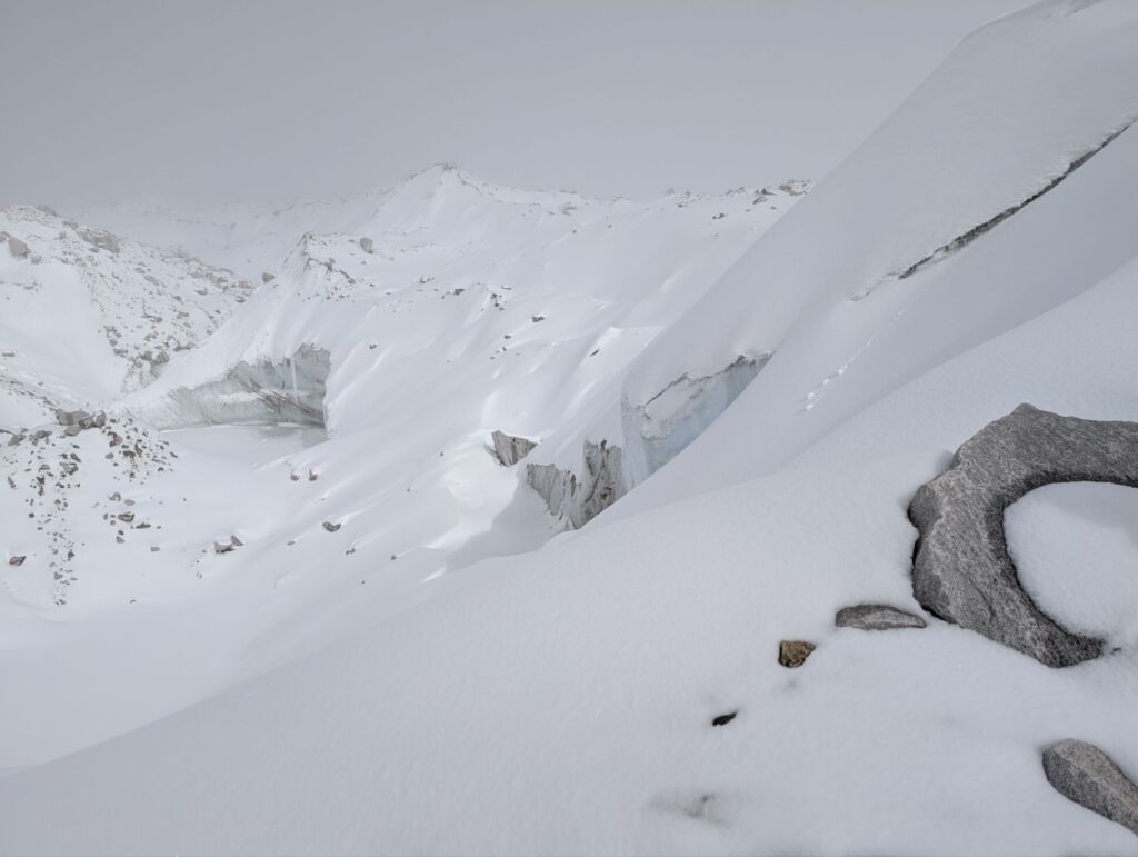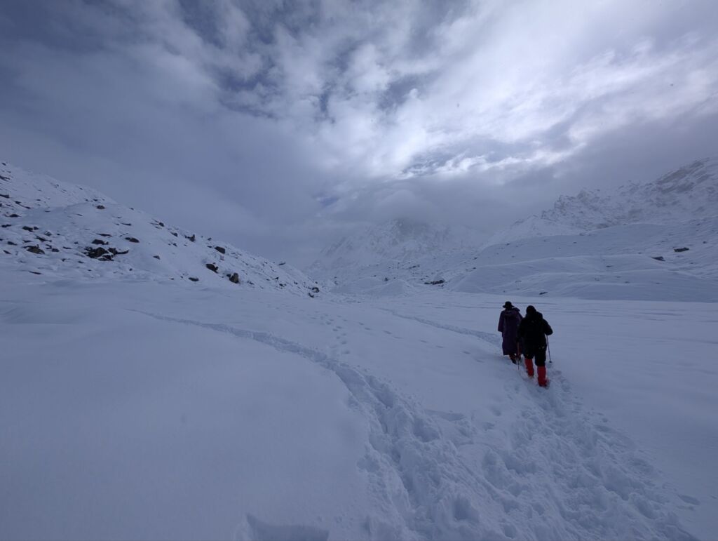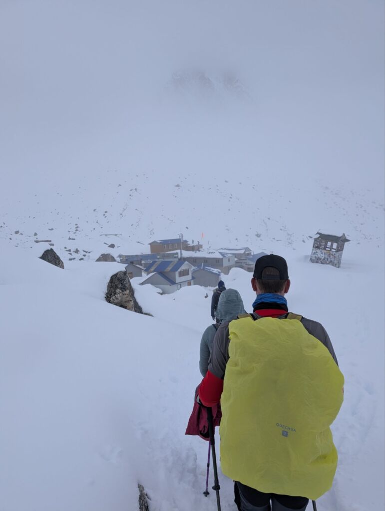 Wir legen also einen neuen Pfad durch den kniehohen Schnee. Es kommt mir abenteuerlich vor auf 5.000 m in einer kleinen Gruppe sich durch den Schnee zu schlagen im Wissen, dass die nächste beste Hilfe ein Pferd wäre, das einen 2 h lang bis zum nächsten Ort tragen müsste.