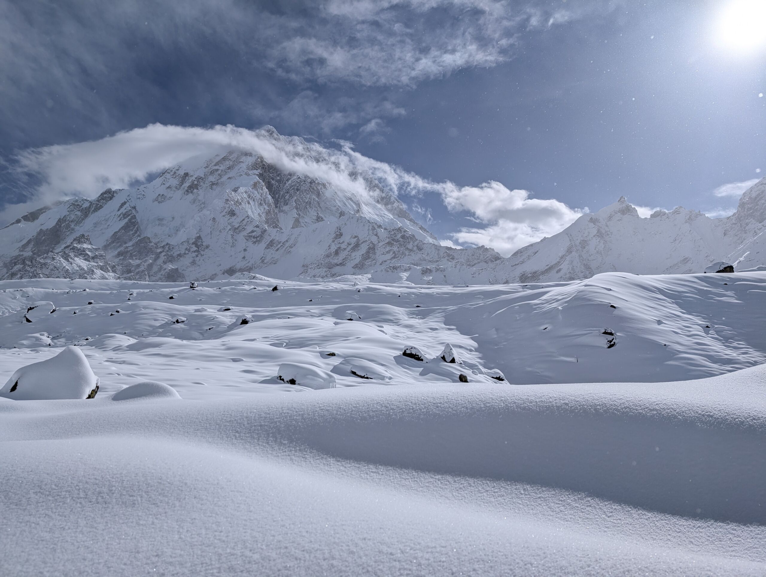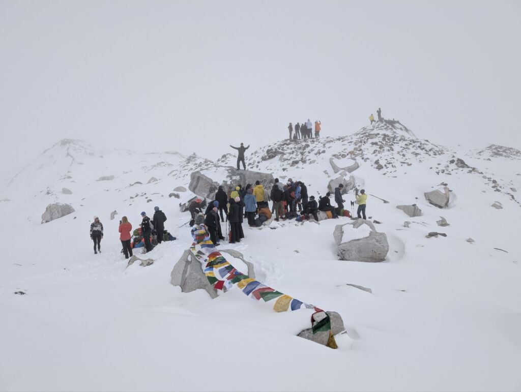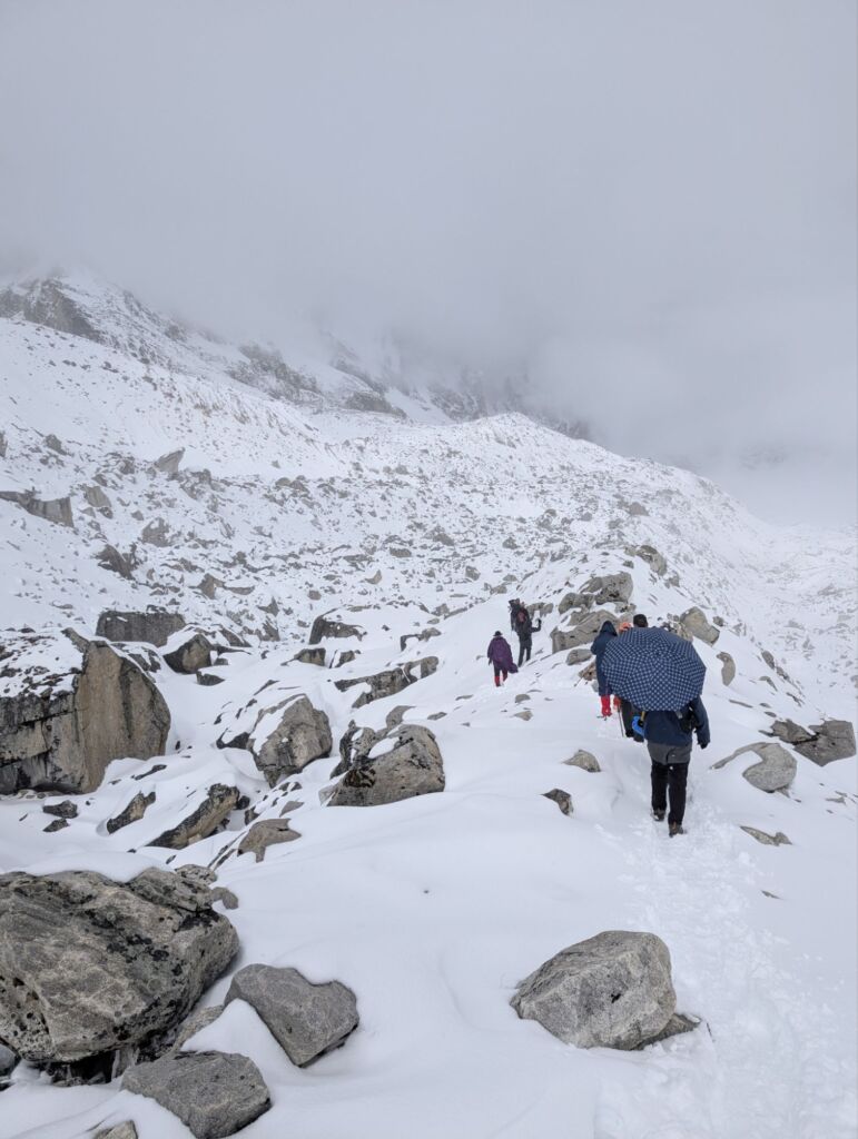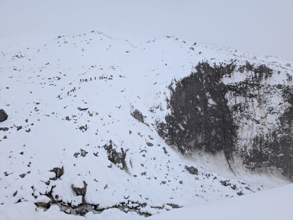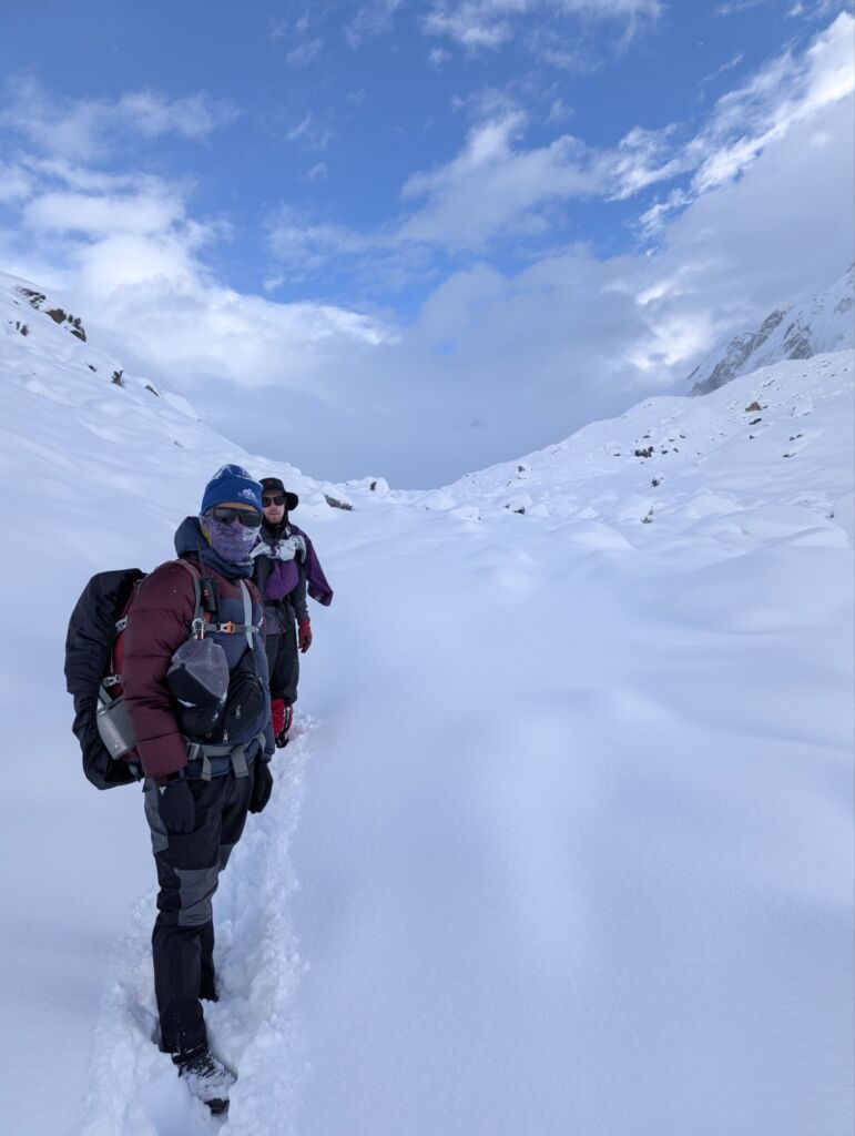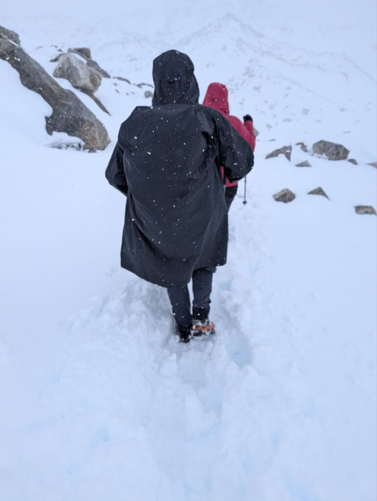 Wir stärken uns mit einem dringend nötigen Mittagessen. Der Schneefalls wird wieder stärker und es steht erneut in Frage, ob der letzte Wegabschnitt zum Basecamp auch miz Blick auf die Uhr machbar ist. Es gibt Überlegungen es auf morgen zu verschieben, aber dann müssten wir zum Basecamp und zurück und dann noch 20 km Abstieg machen. Das erscheint auch nicht wirklich machbar. Ich bin zwar eigentlich durch, aber will es, wie die anderen natürlich auch zum Basecamp schaffen. Also ein zweites Mal machen wir uns also auf den Weg durch den Schnee. Diesmal aber mit mehreren Gruppen.