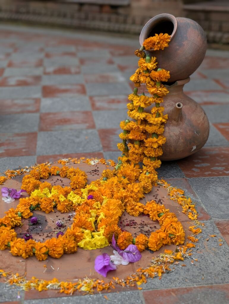 Oft wird eine Girlande aus der Makhamali-Blume, dem Bruder umgelegt – Symbol für Beständigkeit.